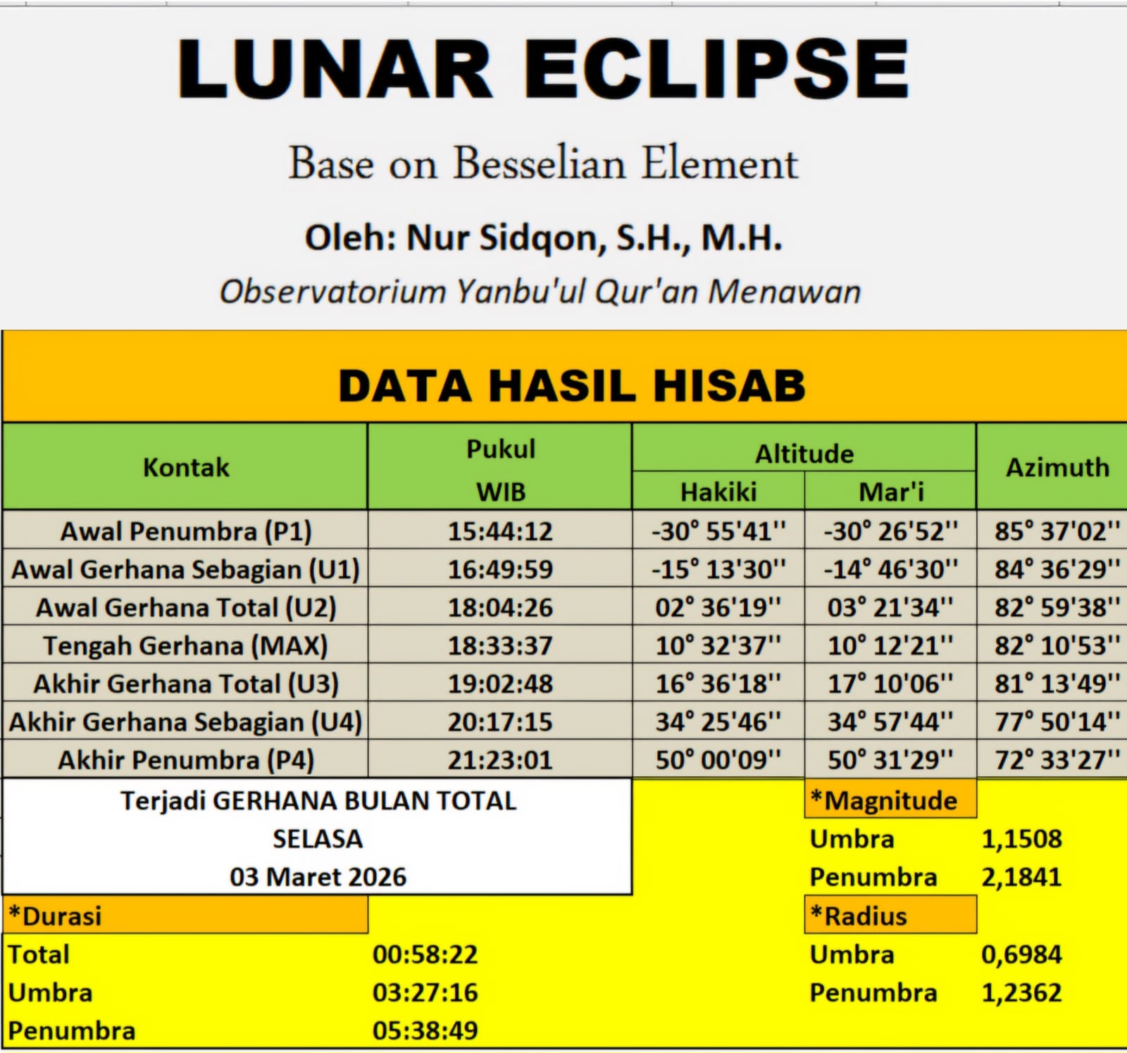 Fenomena alam yang menakjubkan kembali menyapa langit Nusantara pada Selasa, 3 Maret 2026, bertepatan dengan malam 14 Ramadhan 1447 H. Peristiwa Gerhana Bulan Total ini menjadi momen istimewa yang dipantau langsung dari Observatorium Yanbu’ul Qur’an Menawan. Berdasarkan data hisab yang disusun oleh Nur Sidqon, S.H., M.H. dan para santri Pondok Tahfidz Yanbu’ul Qur’an Menawan menggunakan metode Besselian Element, gerhana kali ini tercatat memiliki durasi totalitas selama 58 menit 22 detik, sementara keseluruhan durasi di dalam bayangan umbra mencapai 3 jam 27 menit. Pengamatan langsung ini dilakukan bukan sekadar untuk menikmati keindahan langit, melainkan sebagai langkah nyata dalam membuktikan kecocokan antara perhitungan matematis dengan fenomena yang terjadi di alam.